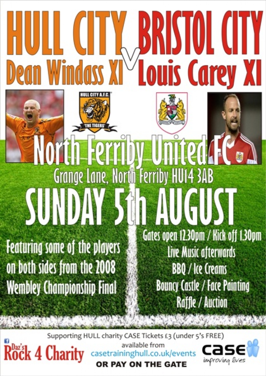 Sunday 5th August - HULL CITY Dean Windass XI v BRISTOL CITY Louis Carey XI at North Ferriby United F.C. Gates open 12.30pm / kick off 1.30pm. Followed by Live Music until 7pm